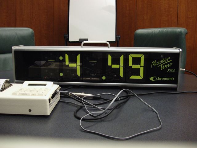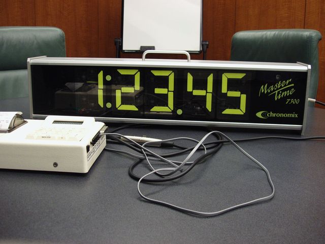Note: the newer Chronomix clocks, including the 7300, had a design flaw that may display the incorrect time. When the Time Machine starts the Chronomix 7300 may display a "4" in the 10's of minutes and another "4" in the 10's of seconds. The incorrect digits continue to display until overwritten by the Time Machine. For example, during a cross country meet, the Chronomix clock may display the incorrect time for the first 11 minutes. The display problem exists while counting up and well as while counting down.